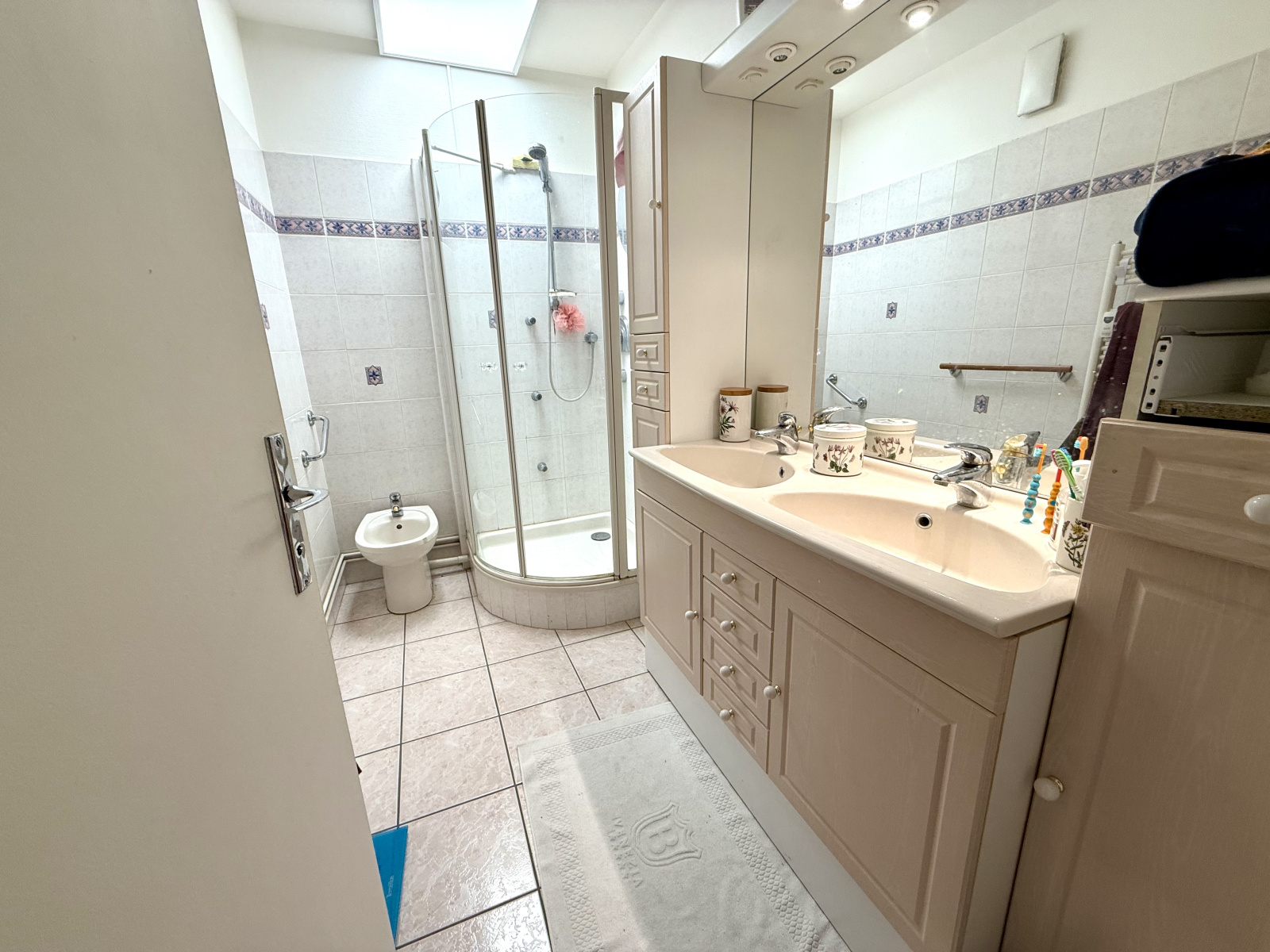 - Salle d’eau : double vasque, douche et sèche-serviettes électrique.