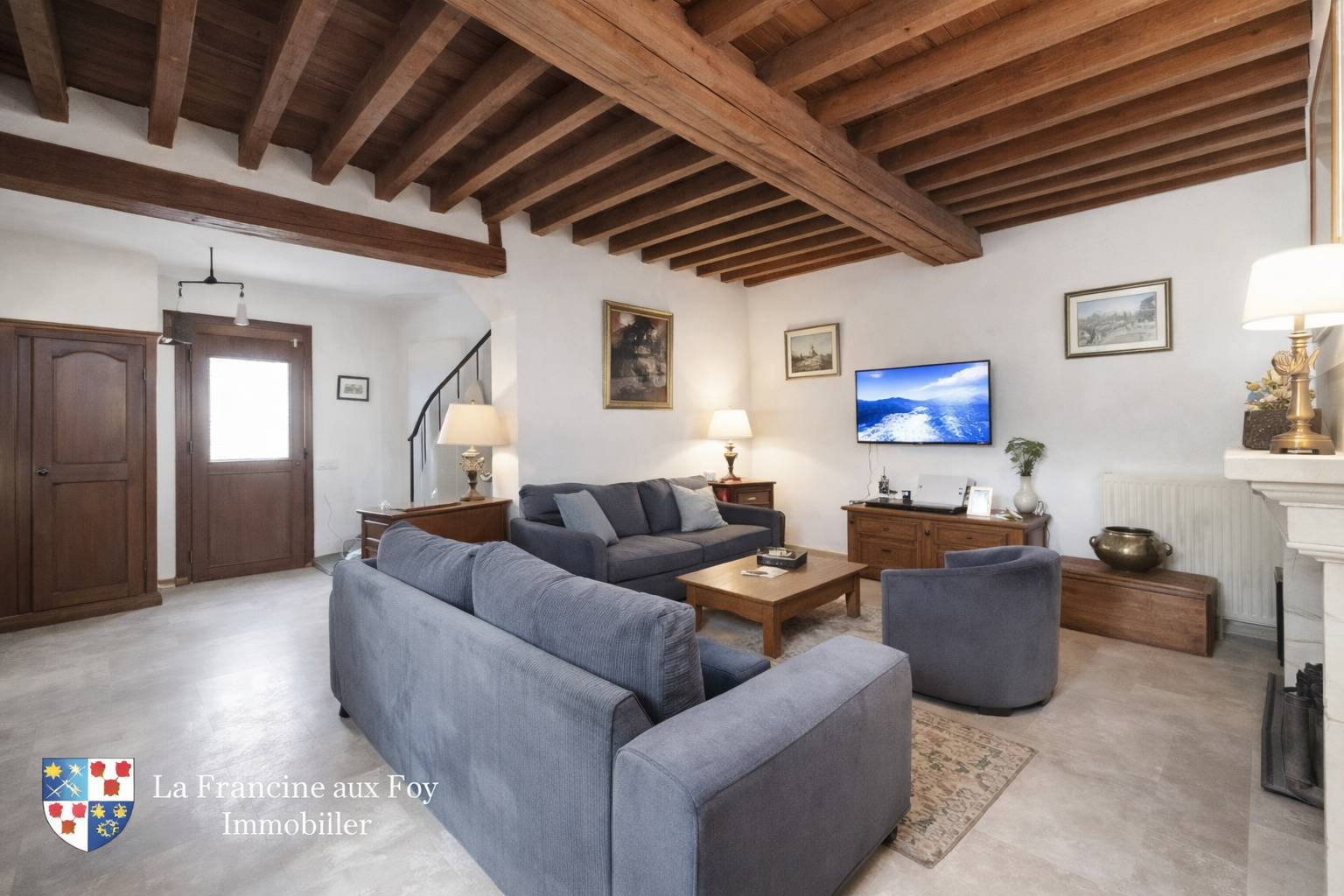 Une entrée spacieuse s’ouvre sur une pièce de vie lumineuse d’environ 55 m², comprenant une cuisine ouverte, aménagée et équipée, ainsi qu’une magnifique cheminée en pierre de taille à foyer ouvert.
