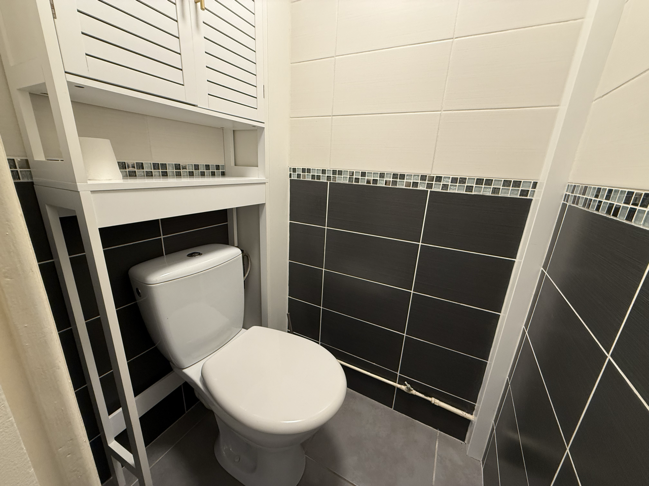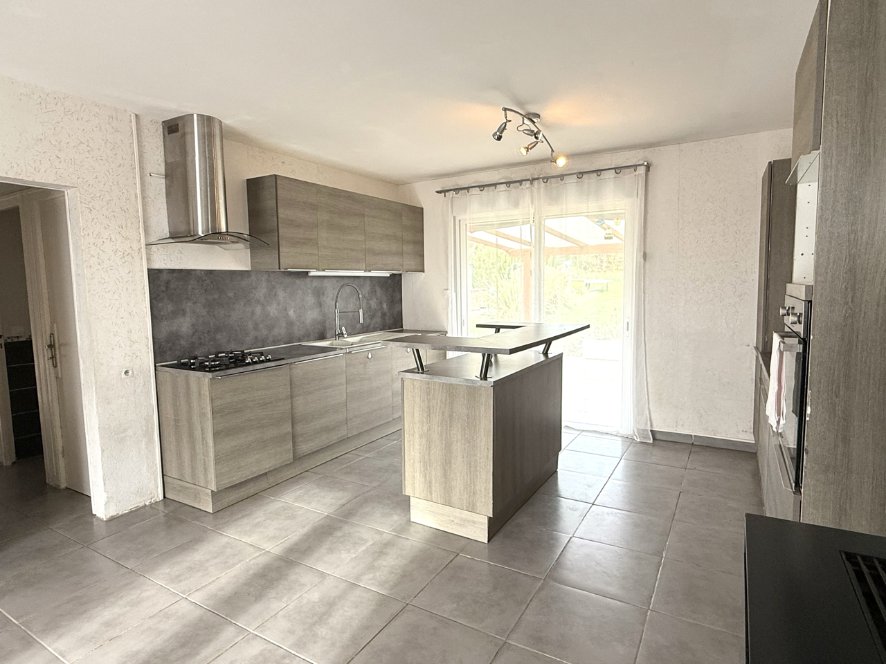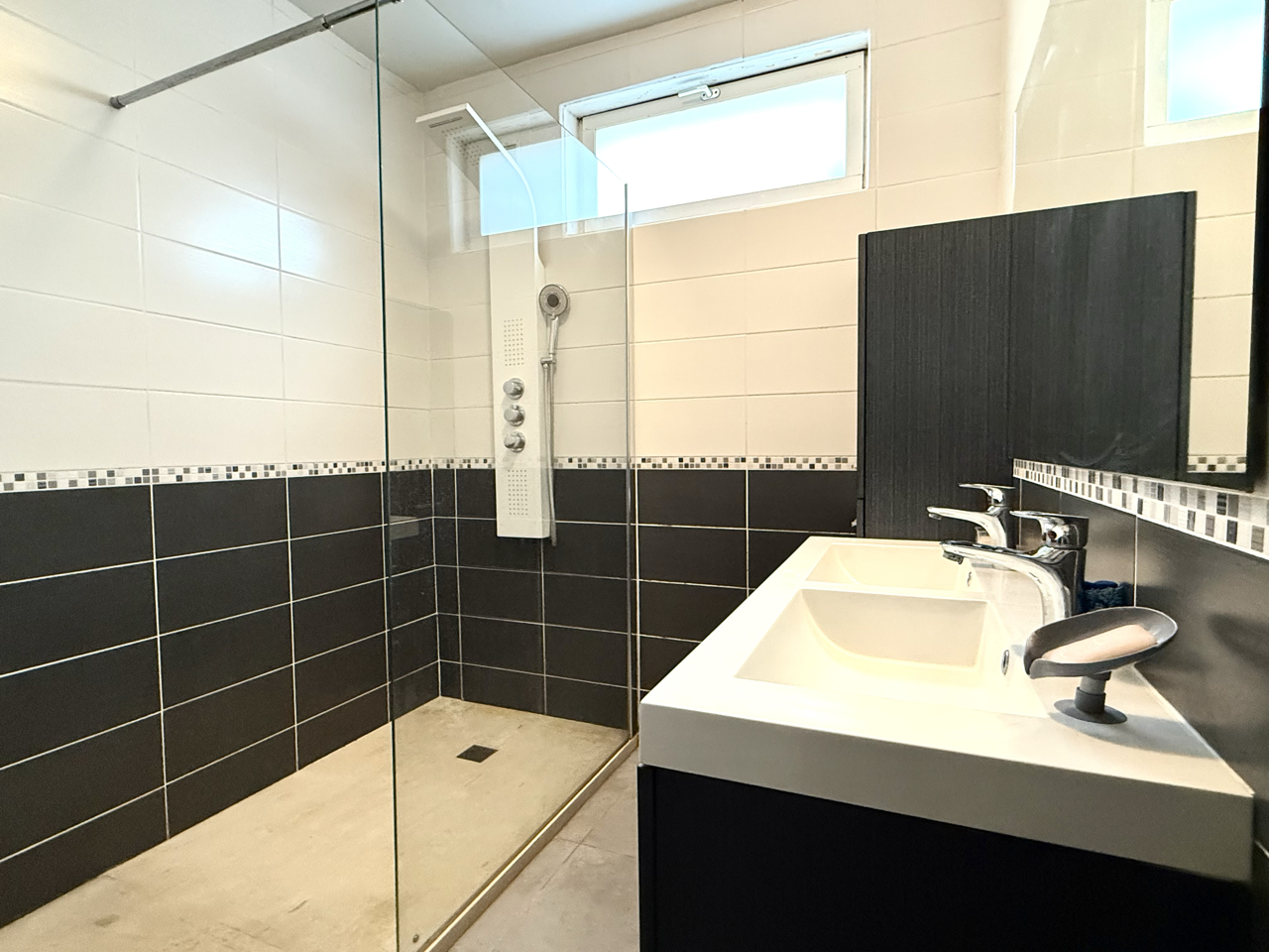 Niveau principal : cuisine équipée ouverte sur la pièce de vie avec gaziniere reliée au gaz par bouteille conssignée, poêle à granulés, fenêtres PVC double vitrage avec volets électriques, WC séparé, salle d’eau avec double vasque et douche italienne, deux chambres. Accès direct à une terrasse d’environ 30 m² donnant sur le jardin.