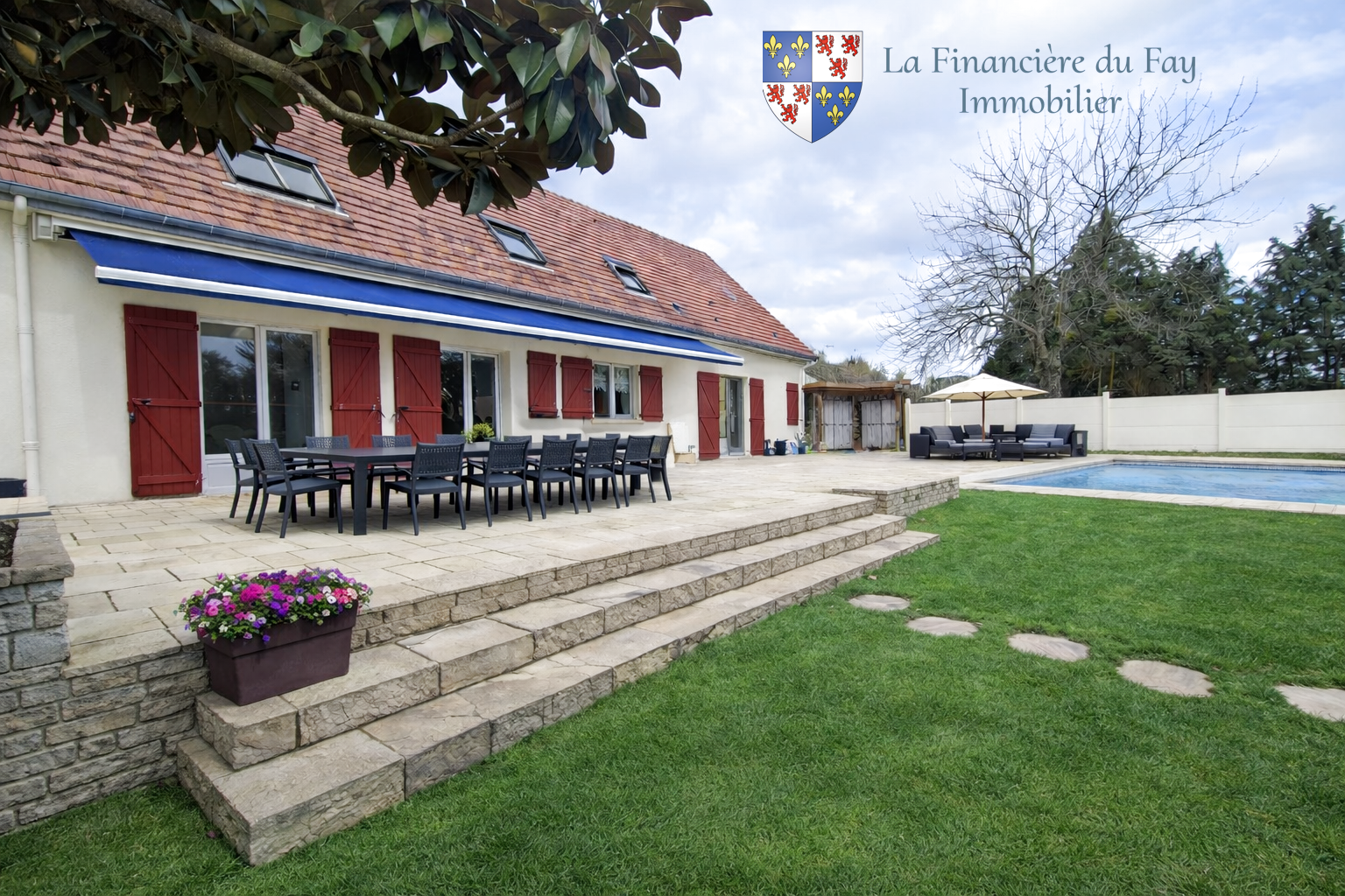 - Grande terrasse en pierre avec store banne électrique sur mesure (7,50 m de longueur)